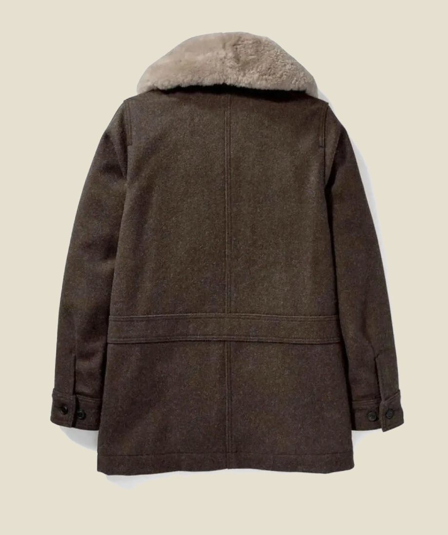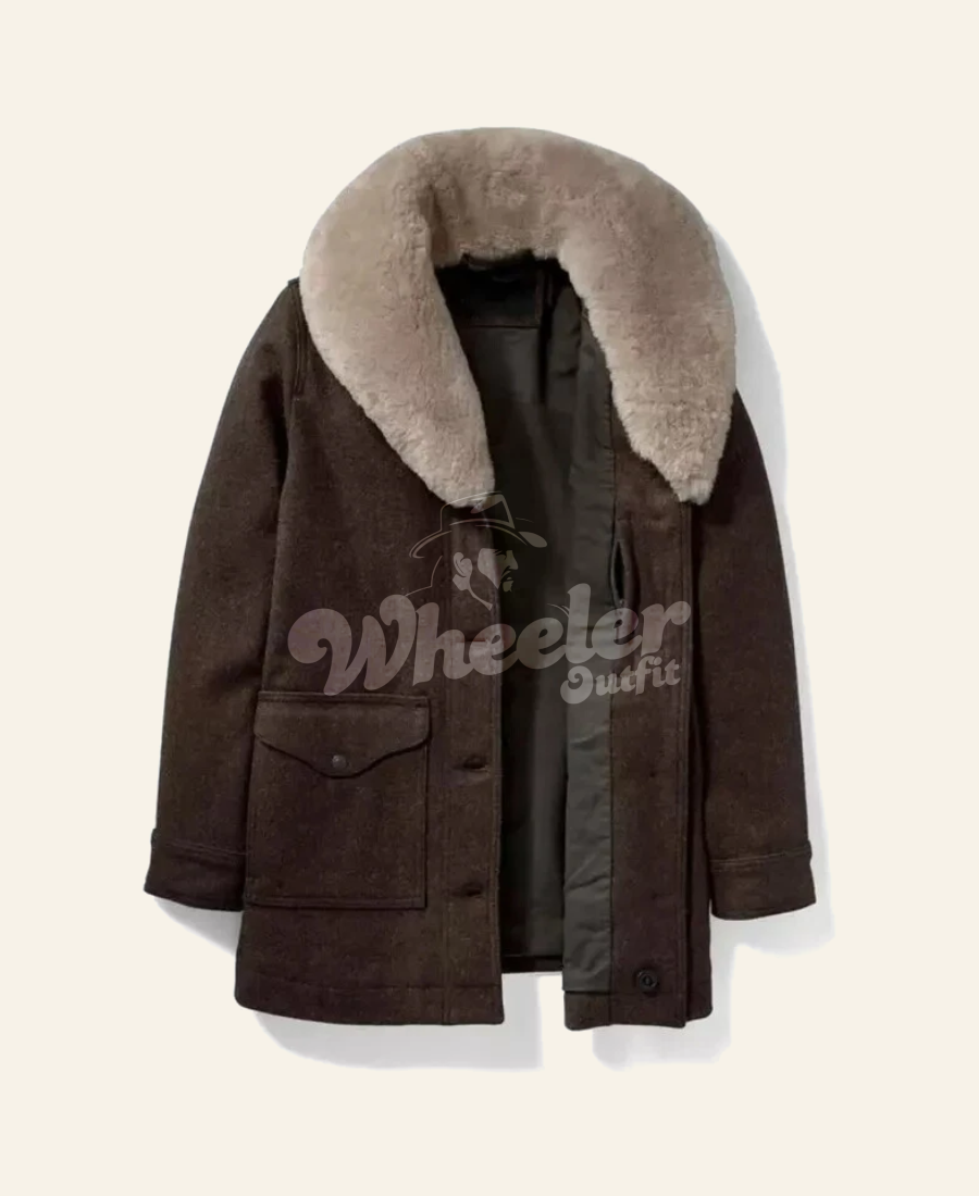 This coat offers subtle waist shaping that flatters without compromising authority. Crafted from a premium wool blend, the coat includes a shearling collar and brown wool coat detailing for extra warmth and classic western flair. Its long line silhouette channels the Long brown coat Beth Dutton style — dramatic in motion, grounding in presence.