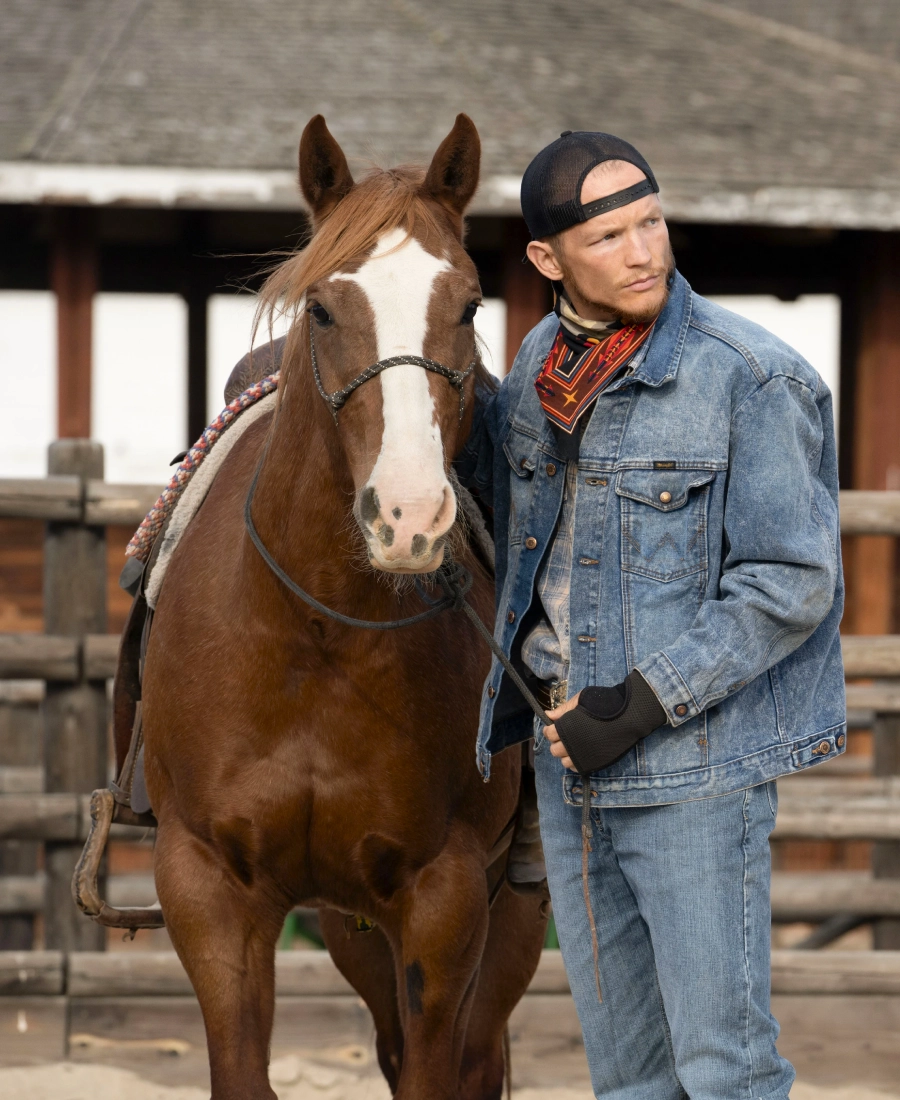 Remember Jimmy’s first big moment on Yellowstone? In the pilot episode “Daybreak” we see him wear his classic denim trucker jacket during the unforgettable branding scene. The one where Rip Wheeler gives him the Yellowstone “Y.” That moment changes everything because it marks the beginning of Jimmy’s journey from a troubled man to a loyal ranch hand. His blue denim Yellowstone jacket quickly became a symbol of his growth and loyalty to the ranch