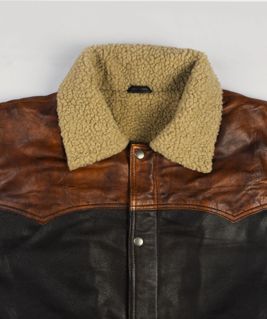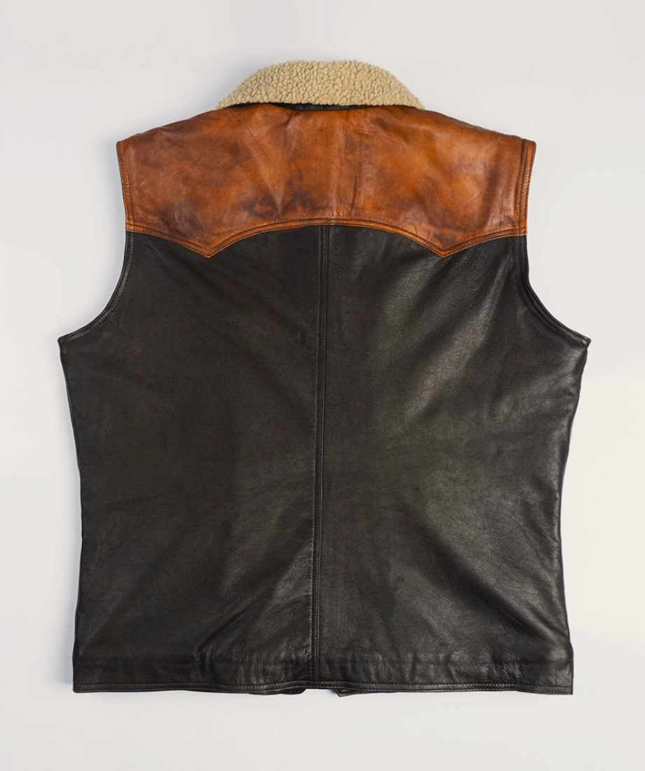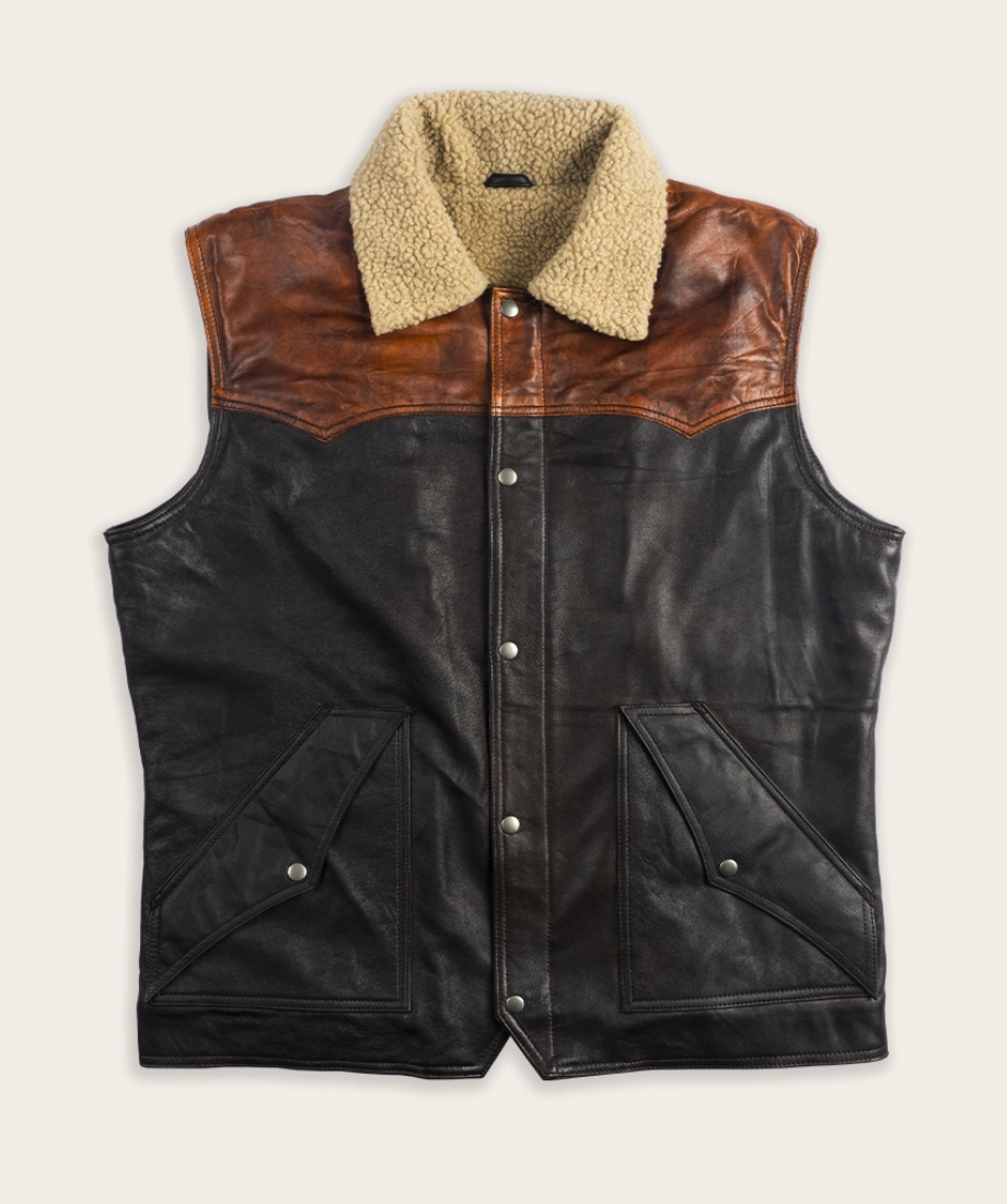 This Yellowstone-inspired sherpa leather vest captures the rugged charm of Western wear while offering durability and comfort. The beauty lies in its two-tone color including a dark brown that covers 70% of the two tone leather vest while the top 30% remains a lighter rusty brown shade. This gives a rugged flair that defines true Western wear. The front is home to a button closure aligned with a zipper, hence offering a double secure fit and flexible style. Crafted with full-grain lambskin leather, this men's sherpa leather vest excels in durability and develops a unique patina over time.