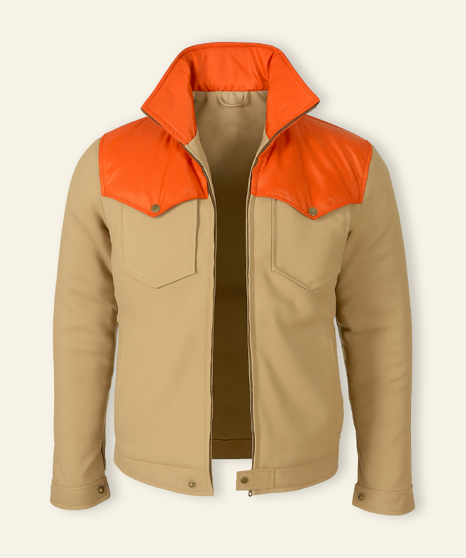 Experience bold confidence like the fearless, rugged character of the Yellowstone ranch with our John Dutton Orange Cotton Jacket. The jacket was inspired by John Dutton's bold and commanding presence and combines rugged western charm with a modern and yet still western vibe. The orange and beige color combination takes the most basic of everyday wear and turns it into a visual statement of confidence.